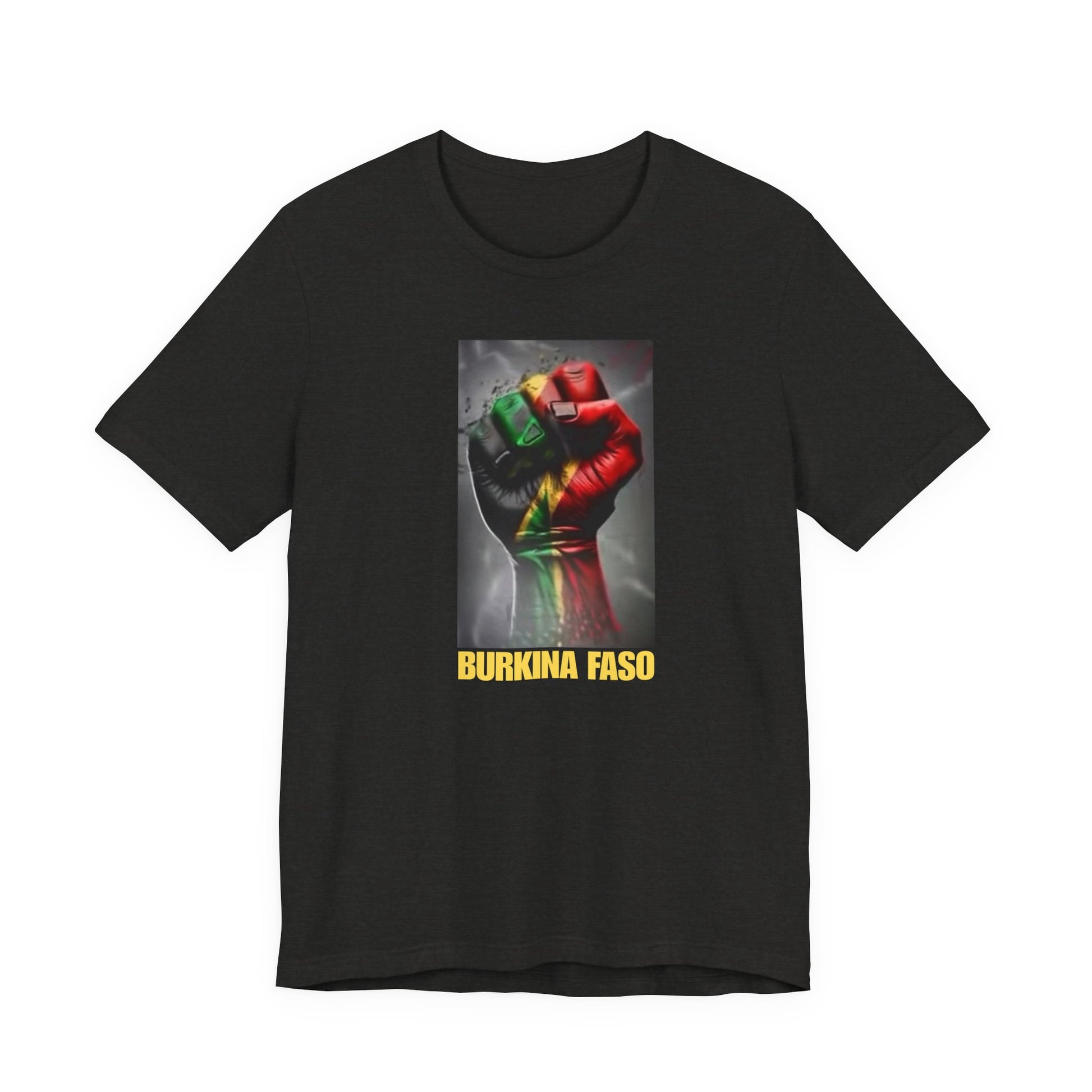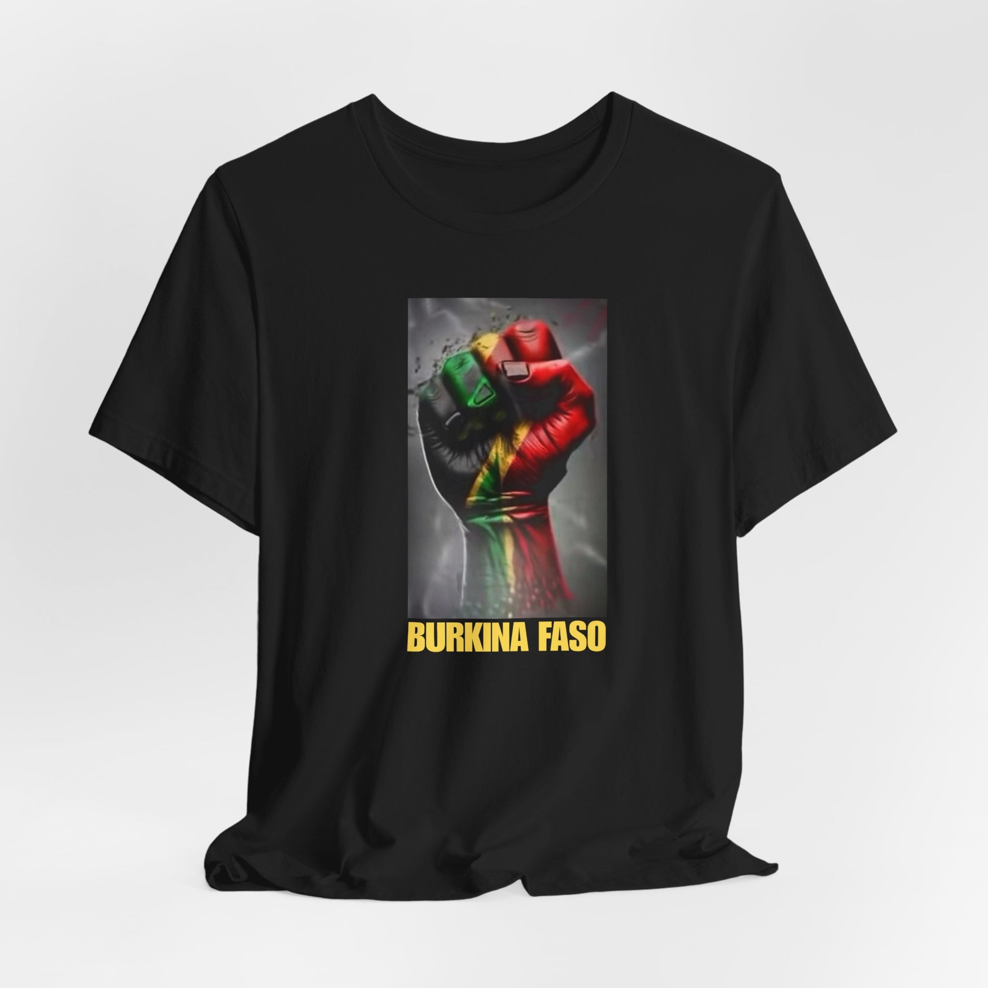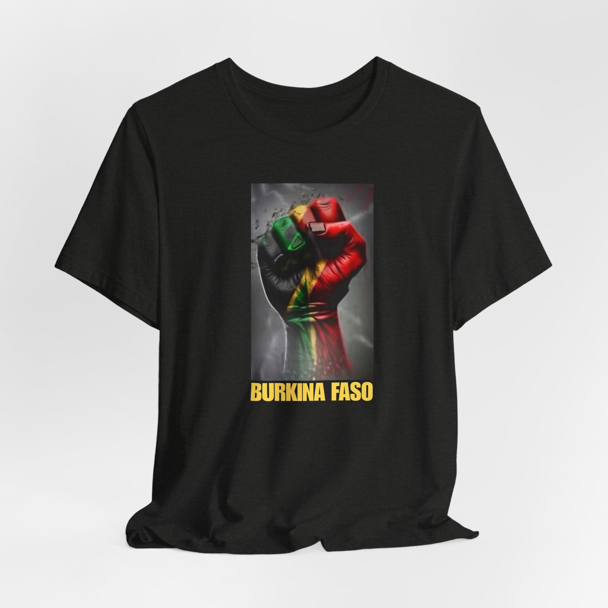This lightweight, breathable tee speaks like home — a soft cotton canvas carrying the colors and shape of Burkina Faso with quiet pride. The front shows a raised fist washed in the national red, green and gold, grounded by a bold “BURKINA FASO” label. The back features the country’s silhouette filled with its flag stripes and star. Wear it to add a meaningful layer to everyday looks, rallies, cultural gatherings, or travel; it sits clean under a jacket or worn alone so the message reads clearly. The fabric drapes well, the crew neck stays put, and the tear-away label keeps comfort front and center. Ethically produced and REACH-certified, this shirt feels responsible as well as personal.