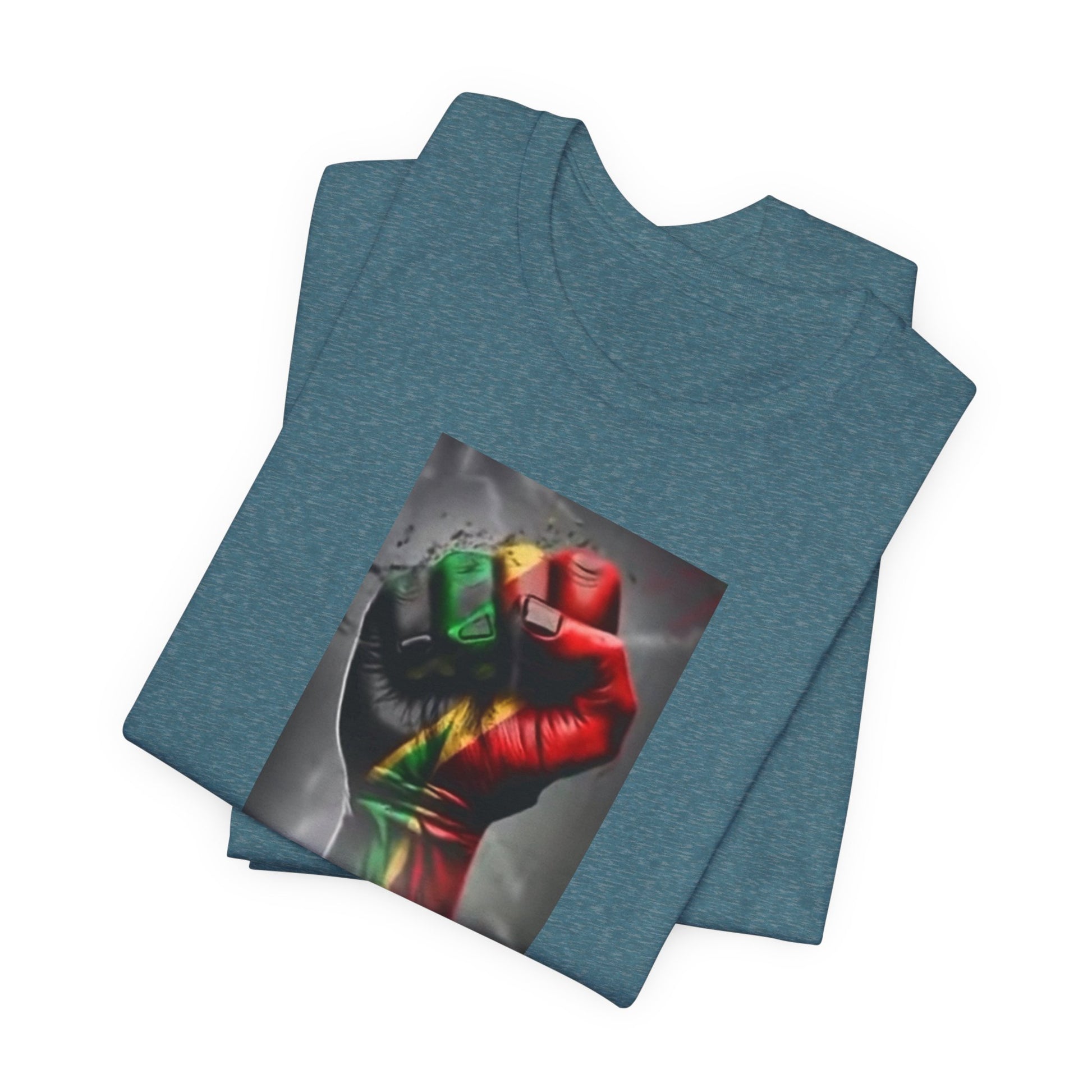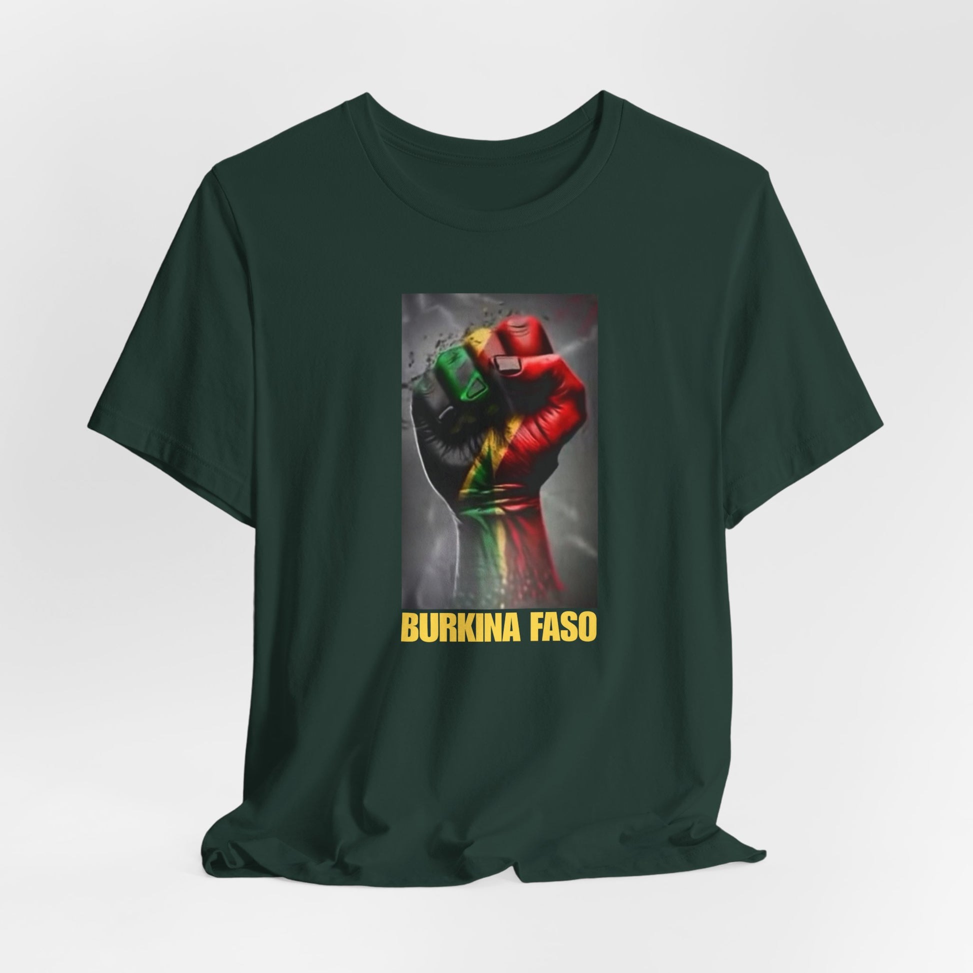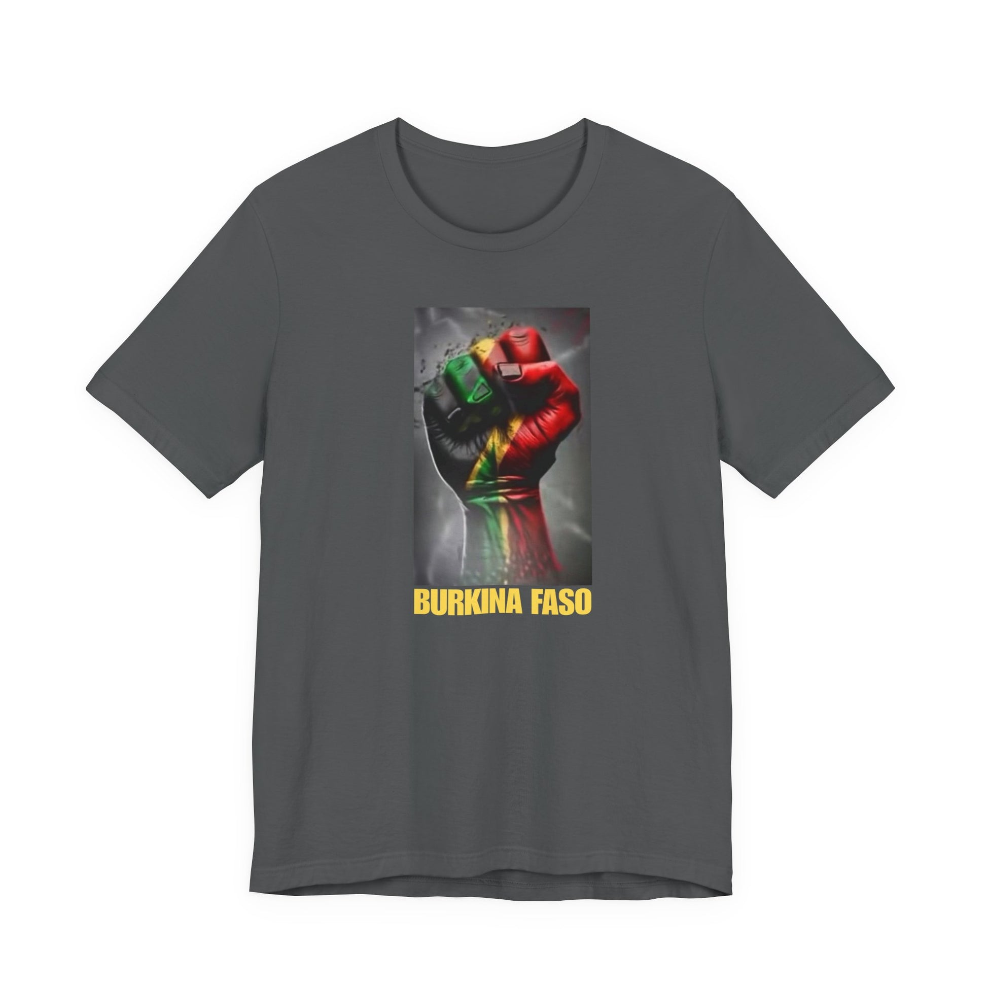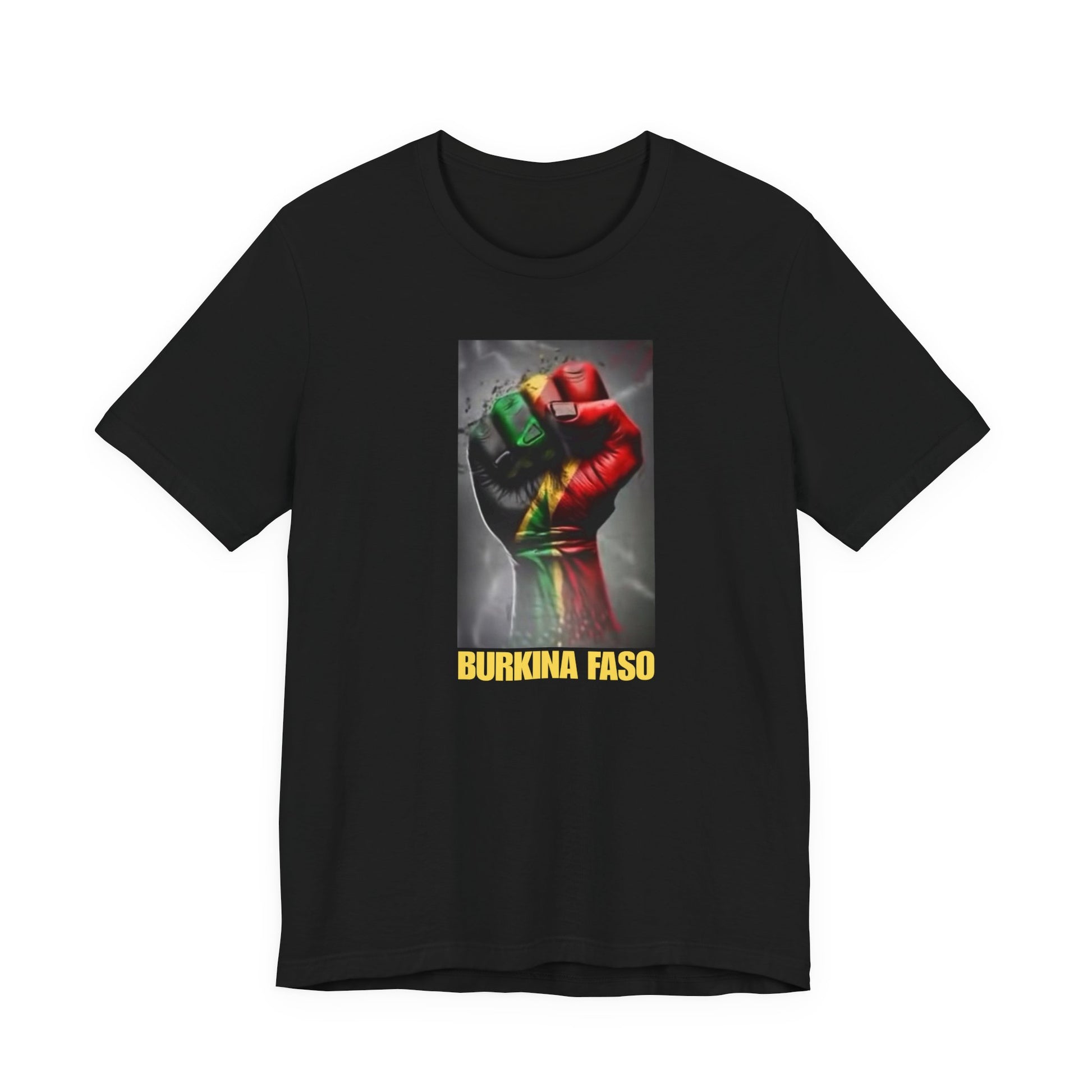 This lightweight, breathable tee speaks like home — a soft cotton canvas carrying the colors and shape of Burkina Faso with quiet pride. The front shows a raised fist washed in the national red, green and gold, grounded by a bold “BURKINA FASO” label. The back features the country’s silhouette filled with its flag stripes and star. Wear it to add a meaningful layer to everyday looks, rallies, cultural gatherings, or travel; it sits clean under a jacket or worn alone so the message reads clearly. The fabric drapes well, the crew neck stays put, and the tear-away label keeps comfort front and center. Ethically produced and REACH-certified, this shirt feels responsible as well as personal.