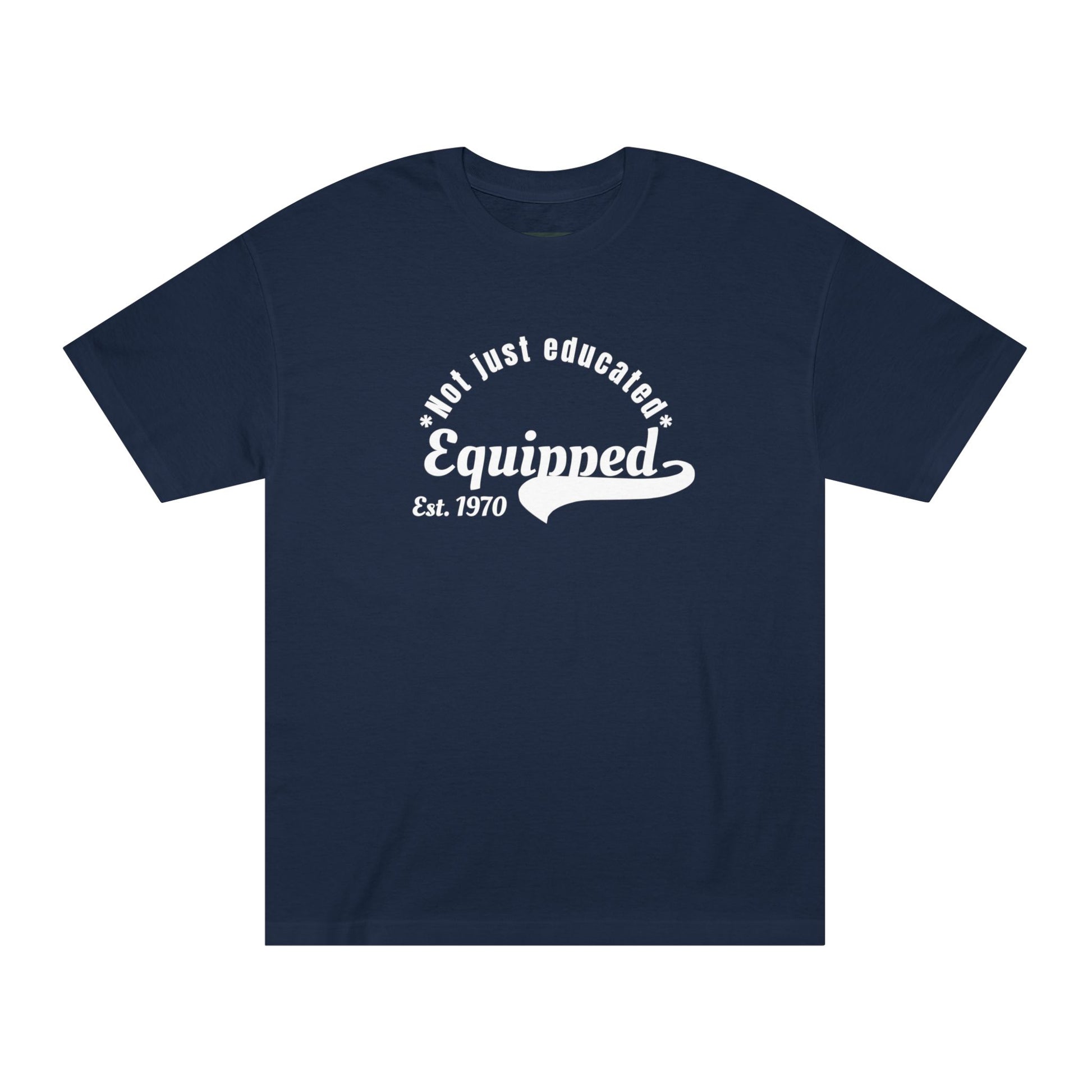Carry a quiet pride that speaks to classrooms, faculty lounges, and graduation photos. This classic tee feels familiar from the first wear — sturdy midweight cotton that holds its shape and a retro-inspired logo that reads like a chalkboard note: 'not just educated. Equinned. Est. 1970.' It sits relaxed across the shoulders, with ribbed collar and reinforced seams so it moves with you through lesson plans, meetings, and casual weekends. Wear it layered under a cardigan for parent-teacher night or alone for a relaxed campus look. The understated navy and clean white print keep the message simple and sincere — a wearable nod to dedication, experience, and the quiet craft of teaching.